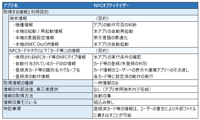 提供アプリが秘密情報や一時情報を取得する場合、以下の項目について巻末の「アプリ別情報」にその内容を開示します。