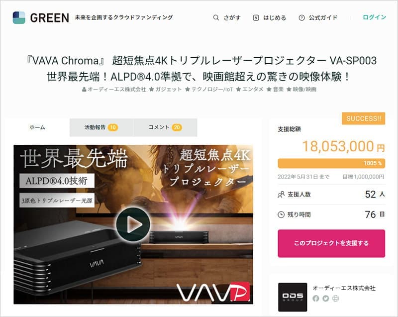 オーディーエス株式会社は、当社がメイン起案者となり「GREEN FUNDING」にて 4K超短焦点トリプルレーザープロジェクター「VA-SP003 VAVA Chroma」のクラウドファンディングを実施中です。