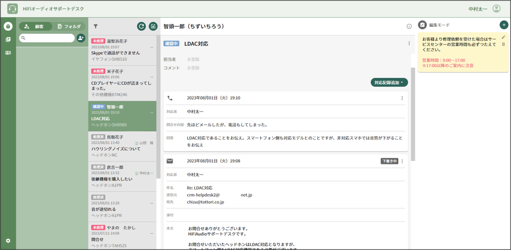 特長 | ・テクニカルサポートに特化した使いやすい電話/メール用CRMシステム ・商品や対応内容など分類項目を簡単な設定で登録 ・問い合わせデータをOpenSearchへ接続し高度な分析が可能 ・情報共有に便利な付箋機能、画像や着色文字も使用できるナレッジ機能 |