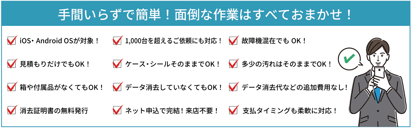 まだ使用できる状態の製品でも、バッテリートラブルなどを抱えながら保管していたり、結局、売却手続きの面倒や情報漏洩などのリスクを鑑みて、費用も手間もかけて廃棄処分とするしかないケースがほとんどでした。