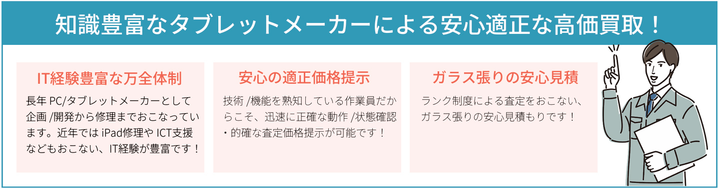PCメーカーとして業務用タブレットの提供とともに、ICT支援事業として全国の自治体、教育機関や法人のiPad修理なども行っている当社の社会的責任として、役目の終わった情報端末の積極的な再利用を促す為に、まずはスマートフォンとタブレットを対象に法人向けのデバイス買取事業を開始する事としました。
